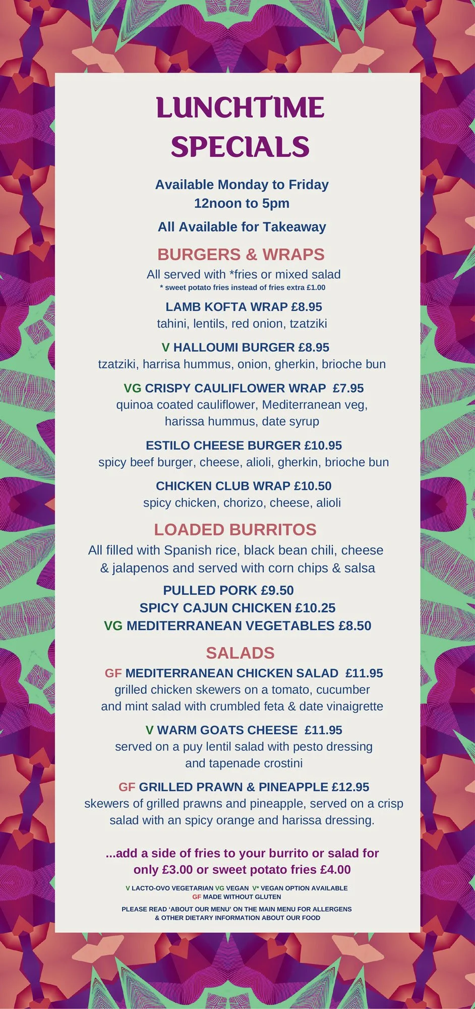 ( V) LACTO-OVO VEGETARIAN (VG) VEGAN (V*) VEGAN OPTION AVAILABLE (GF) GLUTEN FREE (GFO) GLUTEN FREE OPTION AVAILABLE